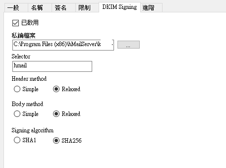 這邊的seletor就是上面你剛剛在申請DNS的時候設定的SELECTOR 像我這個範例就是hmail,之後存檔等待dns生效後應該就可以了