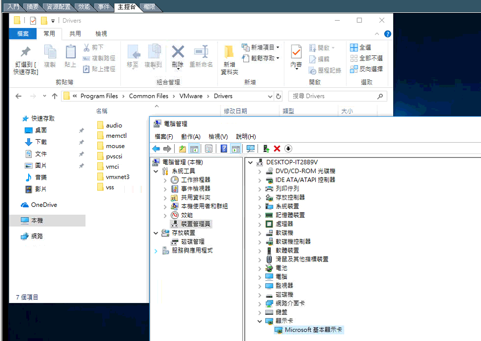 去他的c:\program files\common files\vmware\drivers\video_wdmm 把驅動複製出來到win10的系統去,直接去 我的電腦(按右鍵)->管理->裝置管理員->顯示卡 去更新你的顯示驅動