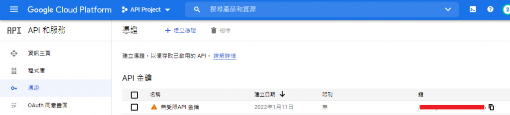 之後你去https://console.cloud.google.com/apis/credentials 這邊新增一個api金鑰如下圖,紅色塗掉的部分就是你的金鑰key