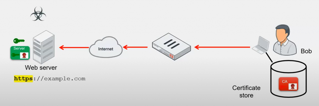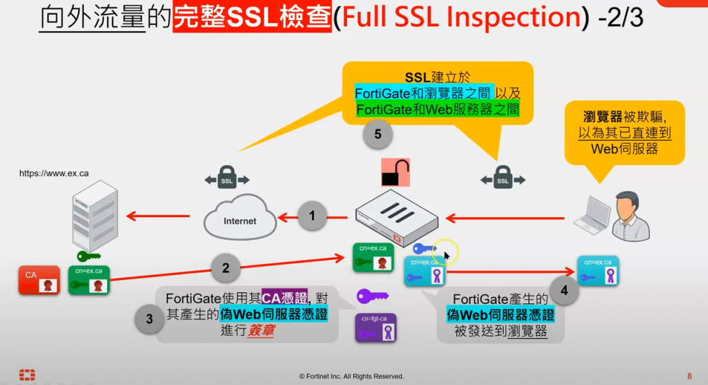 所以只要開啟了完整SSL檢查,你的fortigate為了要看到你的流量,就會重新簽過。這時候你上網的瀏覽器看到的憑證就不再會是原來的憑證,而是你fortigate簽屬過的憑證,所以你防火牆底下的電腦要記得都要匯入你放在fortigate上的那張憑證,不然你的使用者上任何網站應該都會跳https錯誤