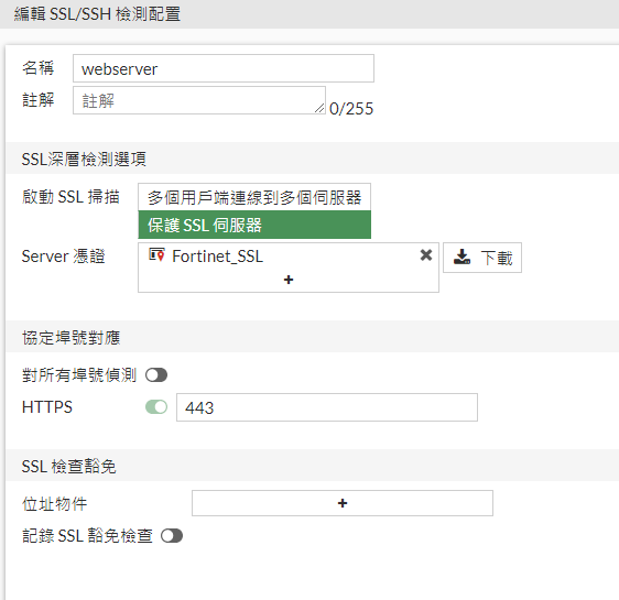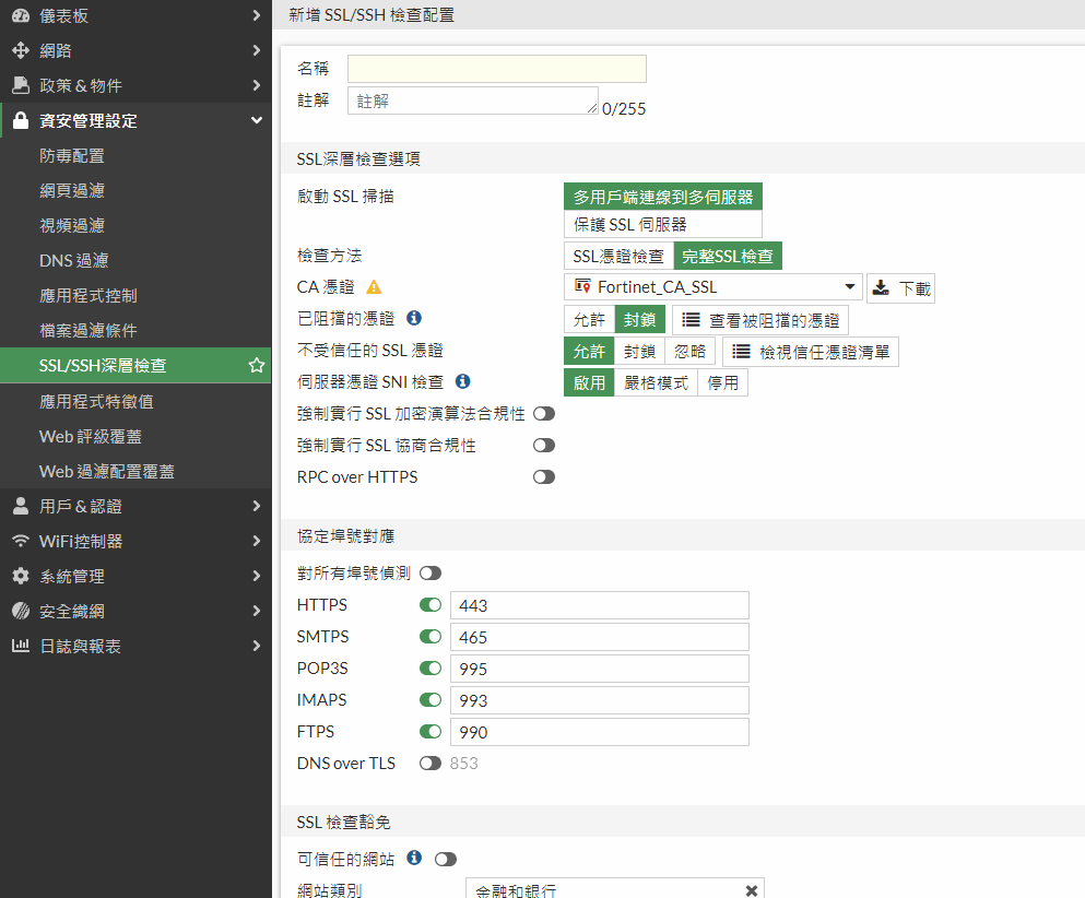 這邊可以來編輯既有預設的幾個範例,也可以新增自己的範例,名稱寫SSL/SSH是代表除了網頁https的SSL加密可以檢查之外,其他的像是SSH這種加密也是可以檢查的,不過fortigate需要私鑰來解密跟檢查SSL流量,所以他會置換掉你的CA憑證