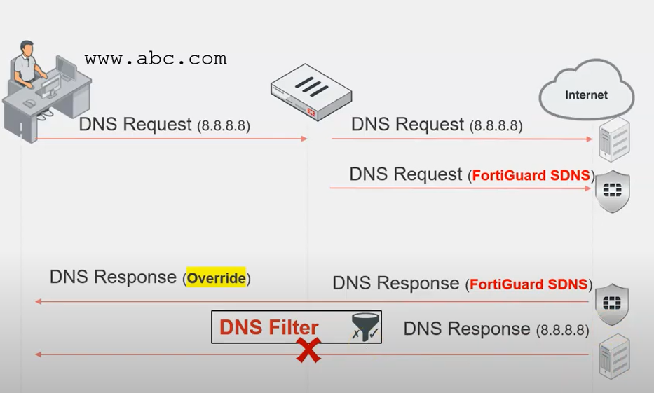 當使用者上網去查詢DNS時,使用者可能有自己設定的168.95.1.1的DNS這沒關係。當Fortifate發現有人在查詢DNS時,他同時也會把這一筆DNS拿去查fortiguard的 SDNS伺服器他的分類,當查詢到這筆DNS分類應該是要block掉的話,此時User的DNS server(168.95.1.1)回傳回來的那個資料就會被擋下來,會被我們複寫成一個阻擋頁面的IP(我們後面會設定到),使用者打開就是會出現網頁被封鎖的畫面,反之則通過。
