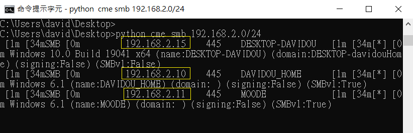 如上圖你就可以看到有三台電腦,且有的還有開smb 1,因為windows cmd沒支援顏色的關係 所以畫面就會很醜,有一堆色碼代號 排版也不漂亮,但是也是可以看就是,如果你不喜歡 可以去下載ConEmu 這套軟體,他有免安裝的。算是漂亮版的cmd就是
