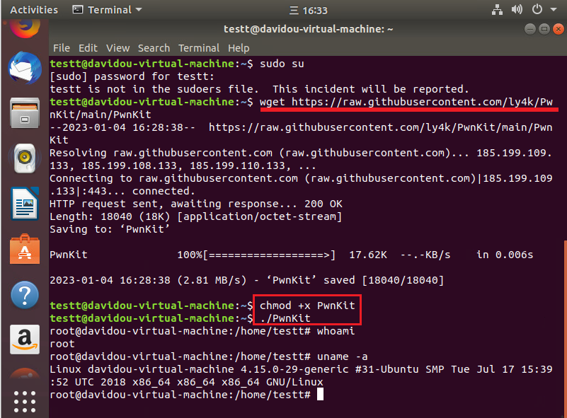 我會改用wget的原因是,部分系統沒有內建curl 還要另外再安裝(他不是內建的),上面可以看到我先sudo過會提示目前這個帳號是沒有root的權限的,當我下載完pwnkit執行完畢後,就拿到root權限了