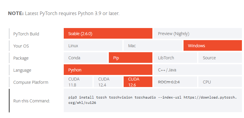 如指令pip3 install torch torchvision torchaudio –index-url https://download.pytorch.org/whl/cu126