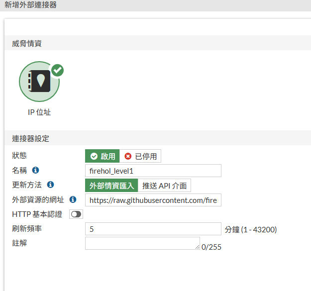 外部資源網址打入https://raw.githubusercontent.com/firehol/blocklist-ipsets/master/firehol_level1.netset